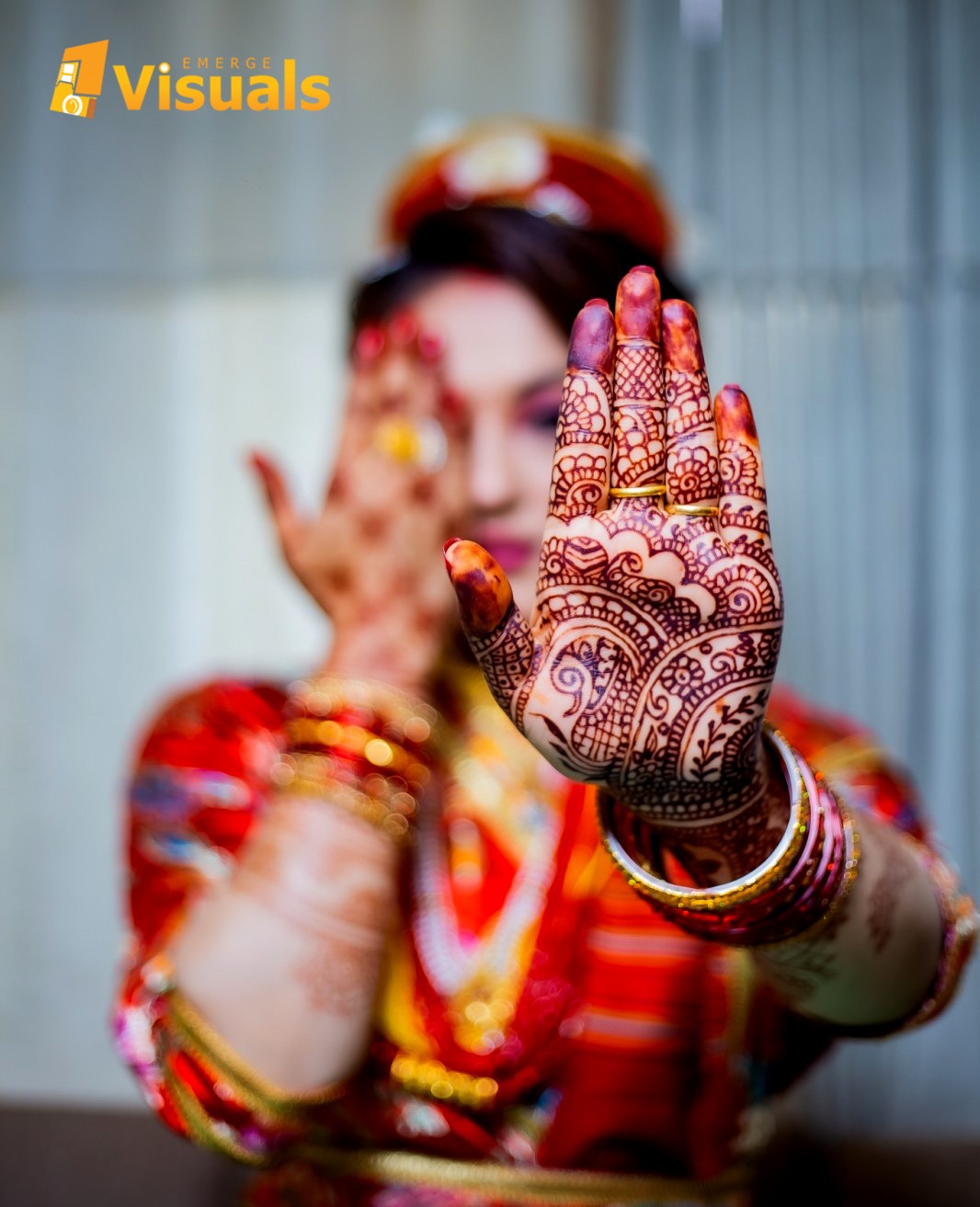 Mehandi photography and videography typically involve capturing the intricate and beautiful designs of the henna on the hands and feet of the bride, as well as the joy and excitement of the mehandi ceremony. The photographer and videographer may also take shots of the bride and her female relatives and friends dancing, laughing, and enjoying the celebration.